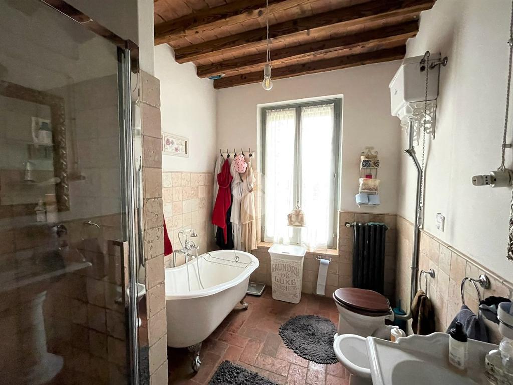 Il primo piano ospita quattro camere matrimoniali e il servizio con sia vasca che box doccia.