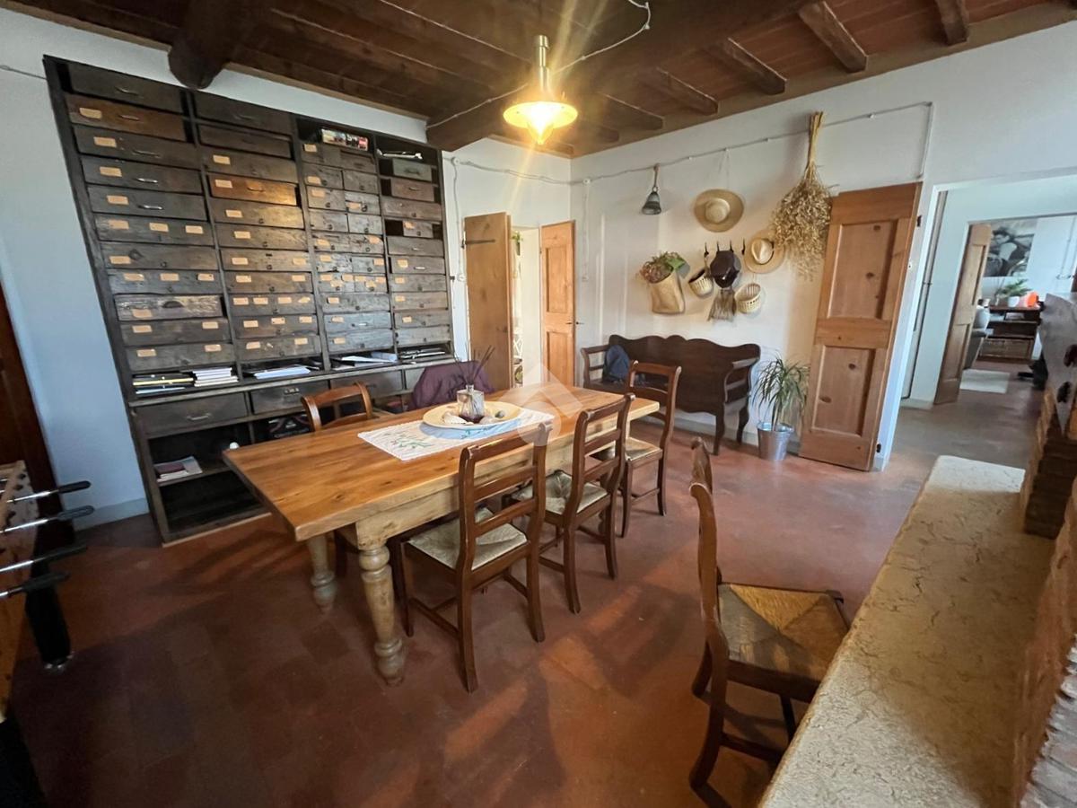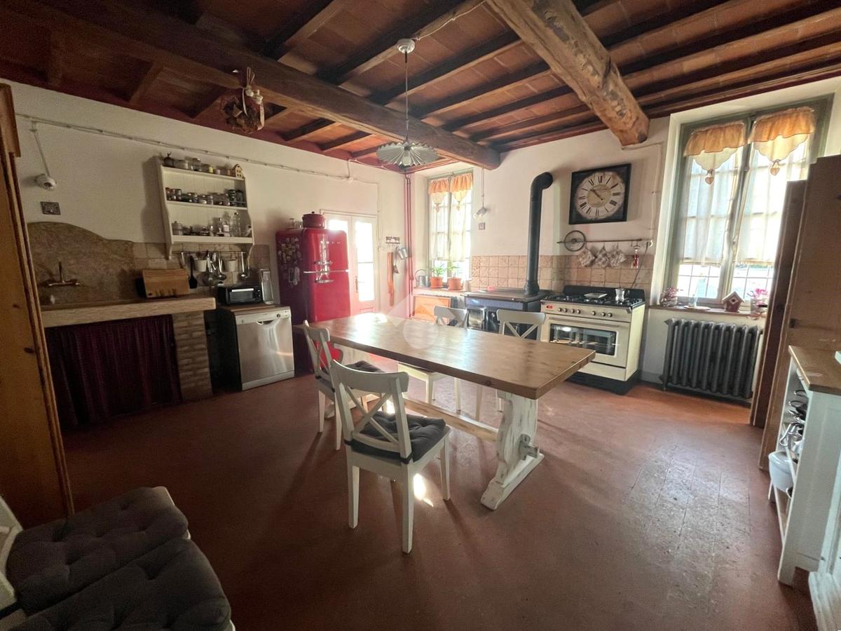 La soluzione è disposta su due livelli. Al piano terra, l'ingresso è centrale e funge da divisorio tra i vari ambienti. L'ampio soggiorno è abbellito dal maestoso camino con i caratteristici mattoni a vista. La cucina è separata e abitabile e presenta una stufa a pellet. Si aggiunge un secondo salottino, affiancato da uno spazioso locale lavanderia.