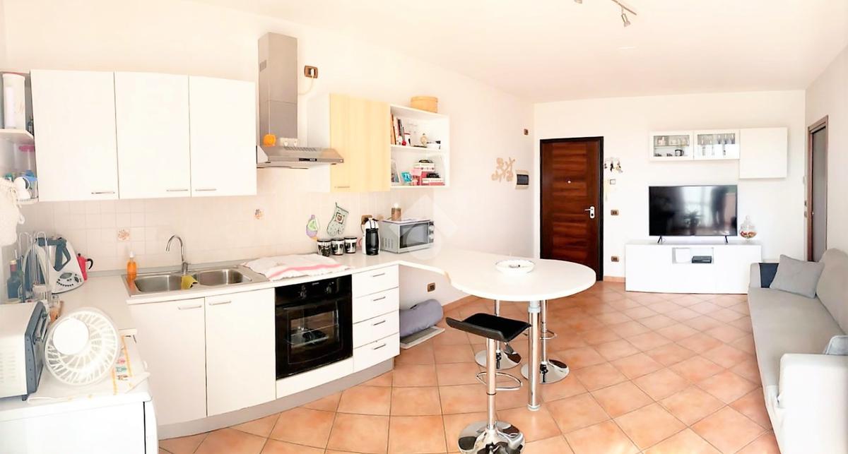 L'ingresso è diretto nella zona giorno con angolo cottura a vista e accesso al primo balcone.