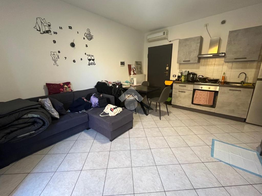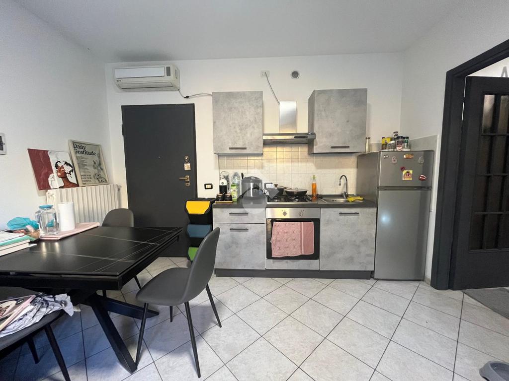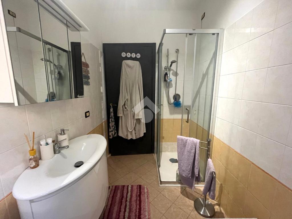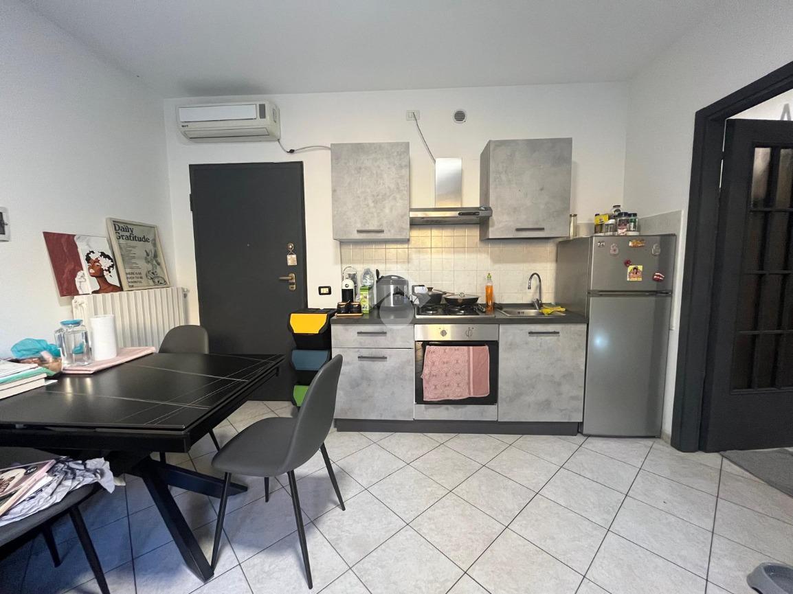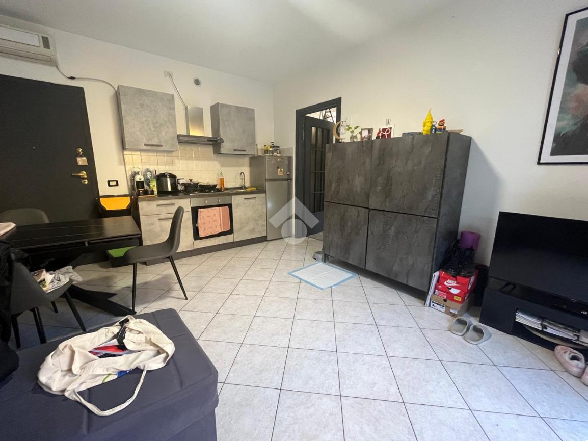 L'ingresso è diretto nella zona giorno con angolo cottura a vista, dal disbrigo si accede al servizio con box doccia e attacco per lavatrice e alla camera da letto matrimoniale.